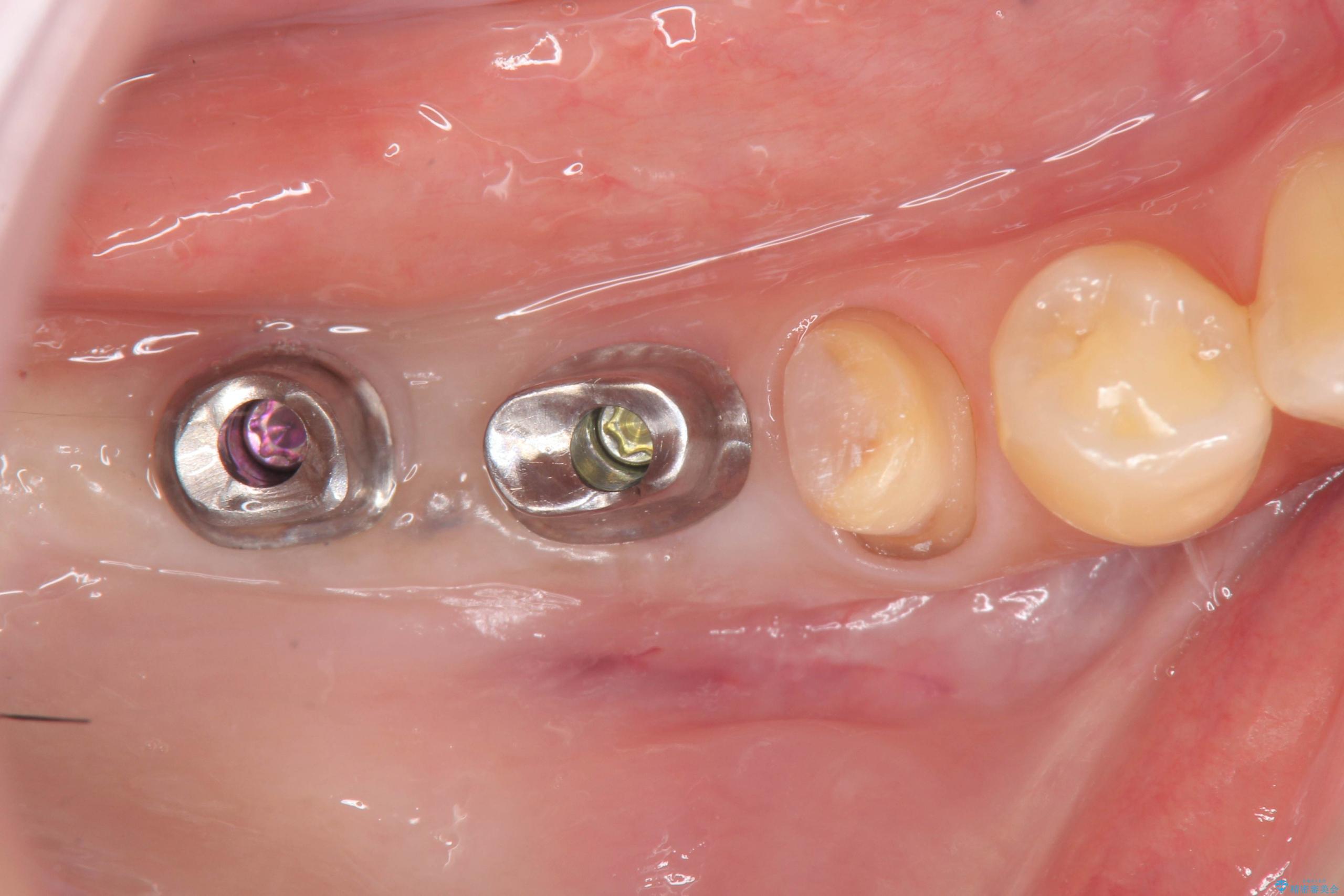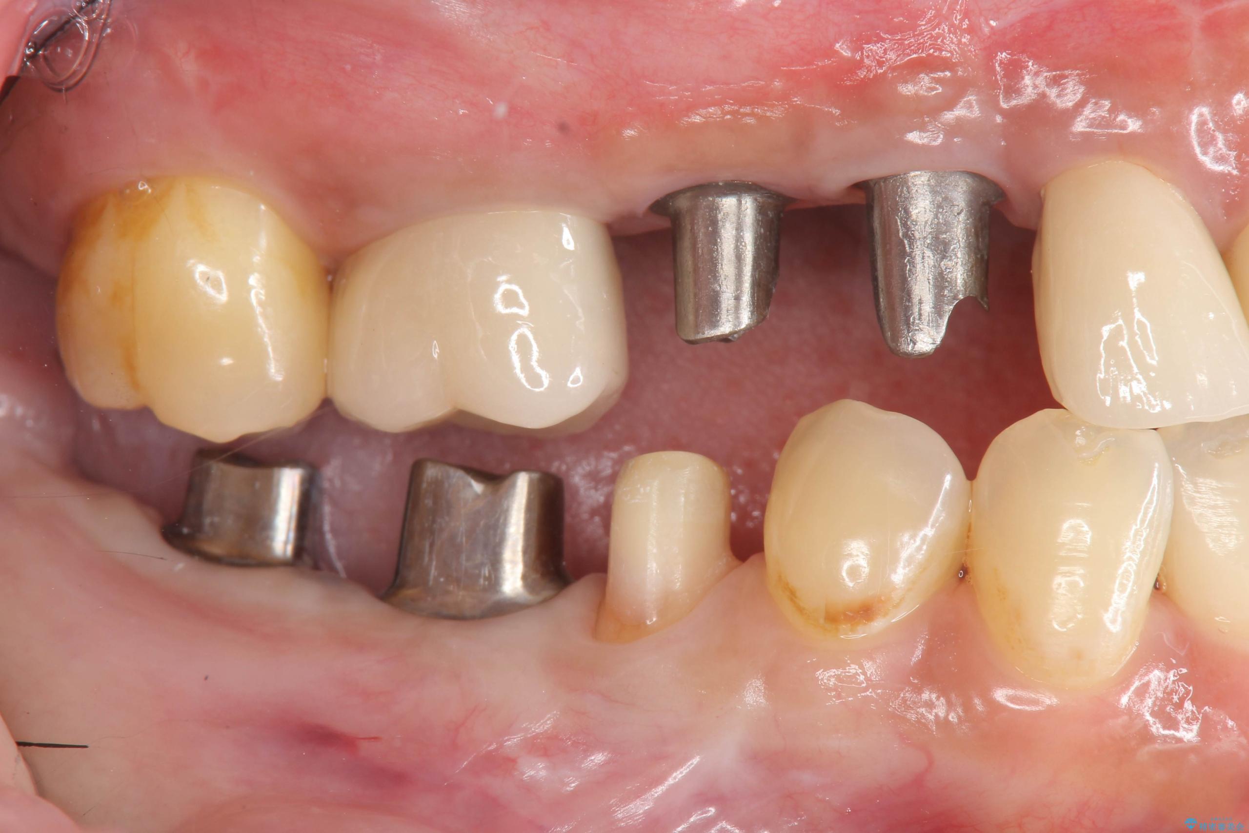 長期的な予後が見込めない歯は抜歯という選択をさせていただき、インプラントを用いて安定した噛み合わせを再構築する治療計画といたしました。