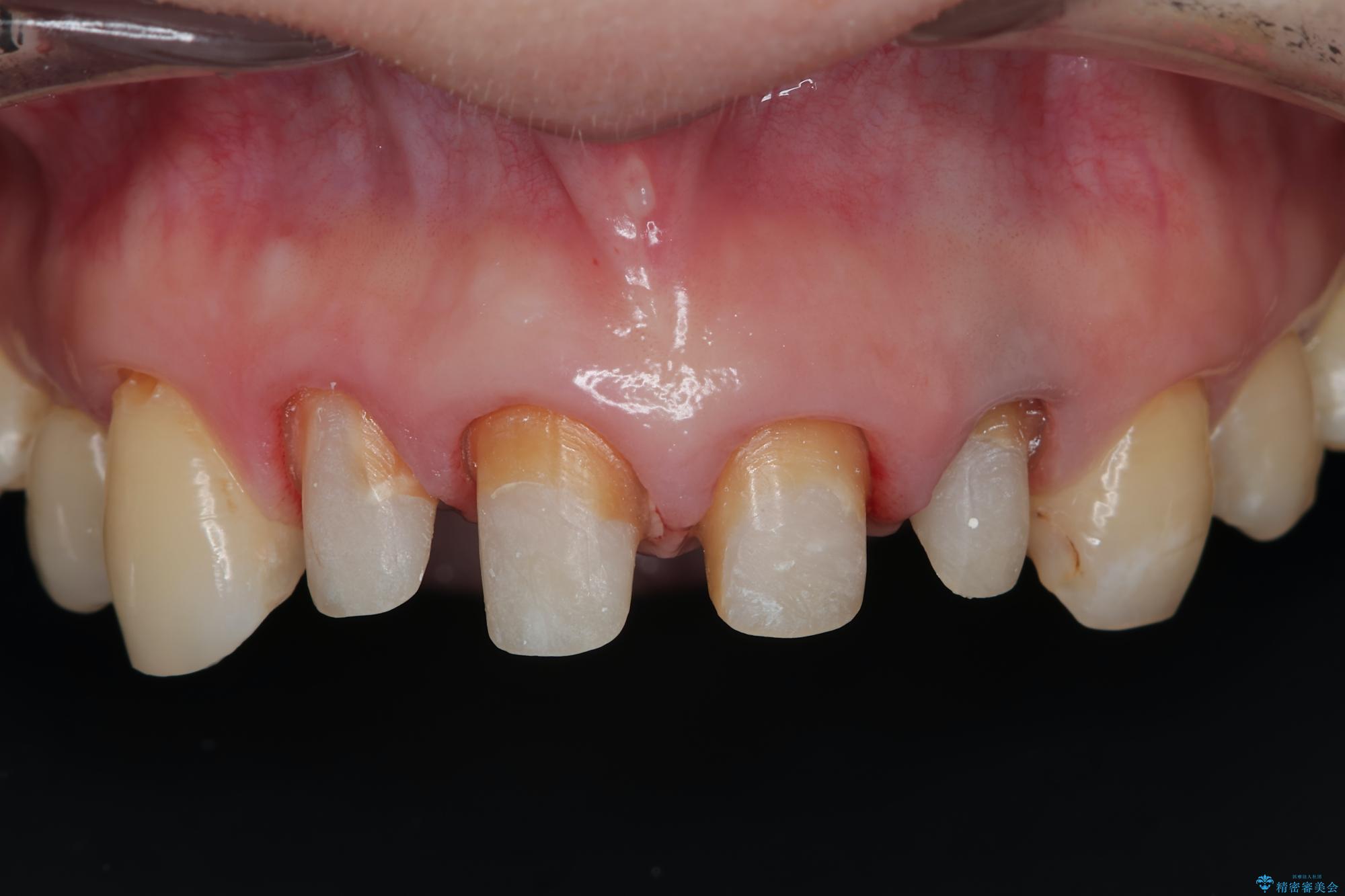 レントゲン検査の結果、前歯4本は以前の根管治療が原因で変色し、根の先にも炎症が見られました。そこで、根管治療をやり直して根の病気を治し、ジルコニアクラウンで美しく修復する計画です。