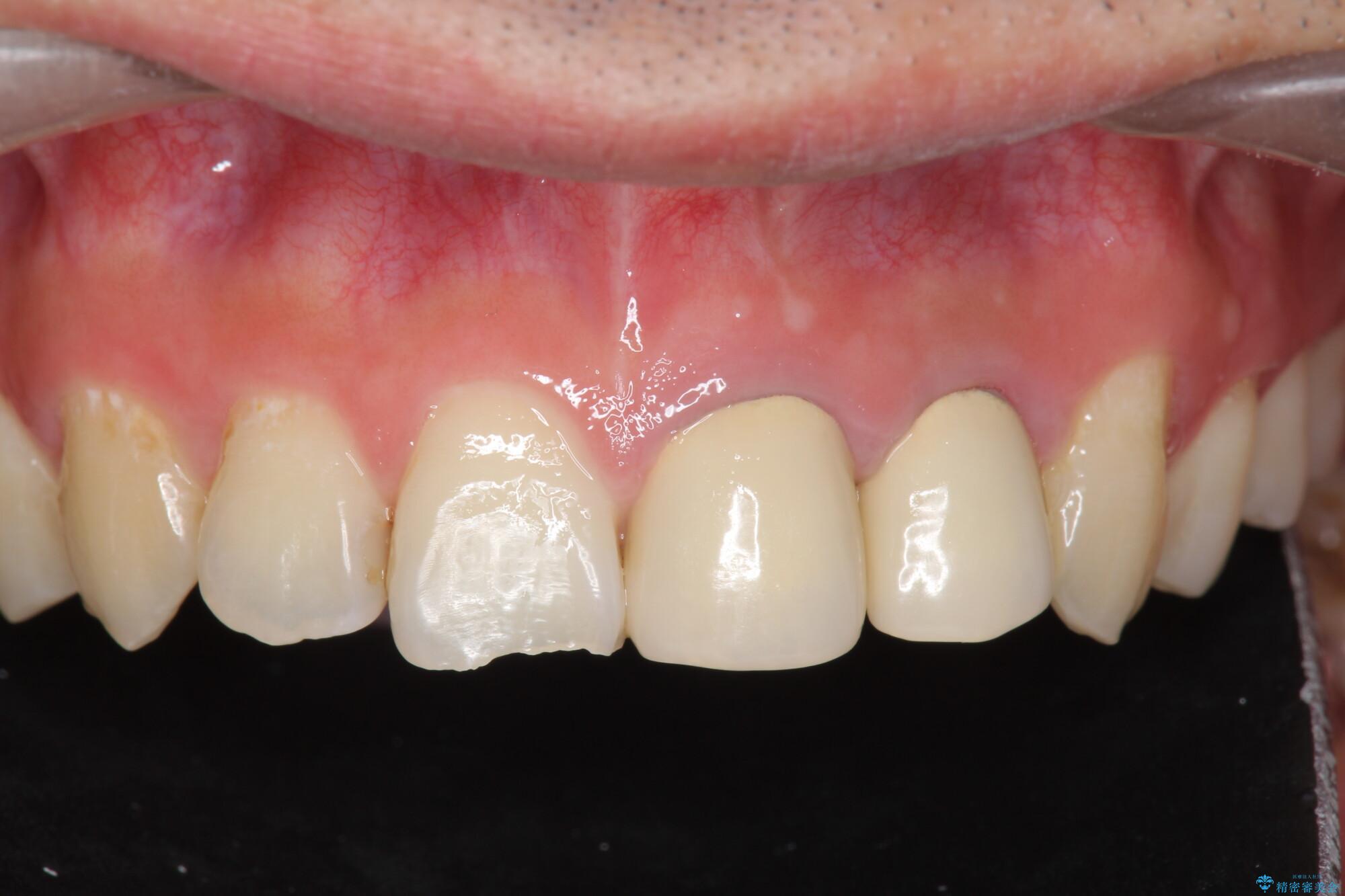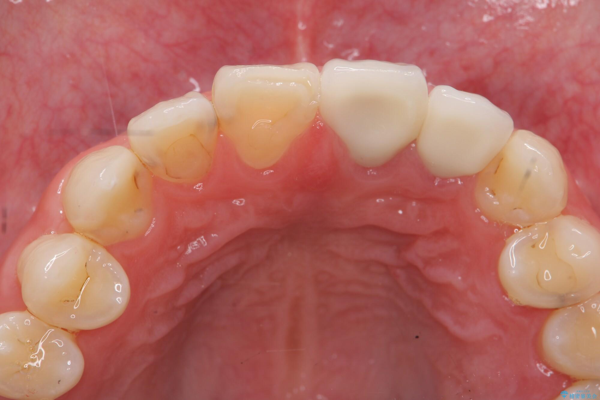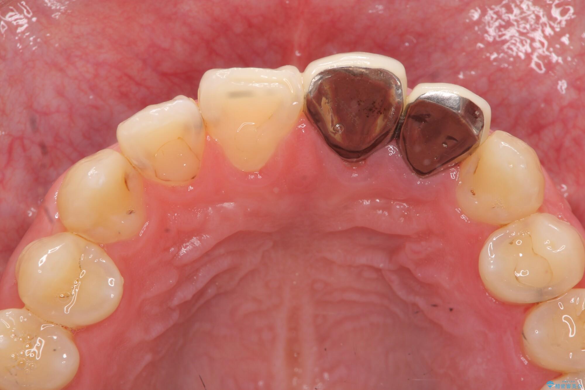 前歯を保険適用のクラウンで治療したが、色味や歯ぐきの黒ずみが気になるとご来院されました。